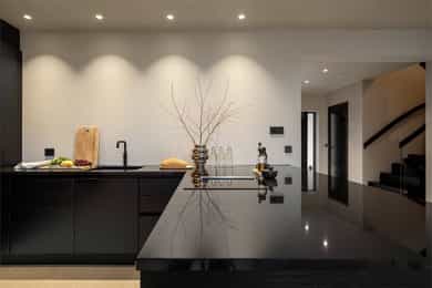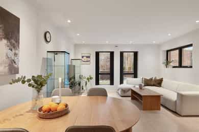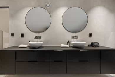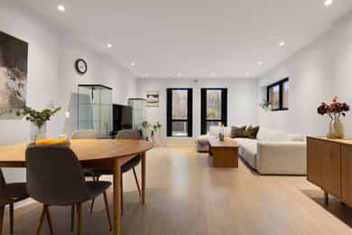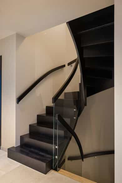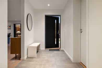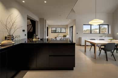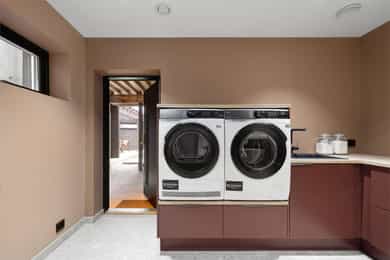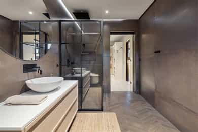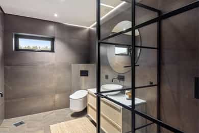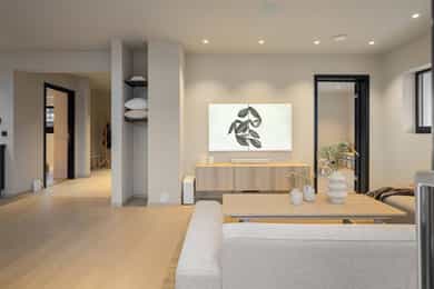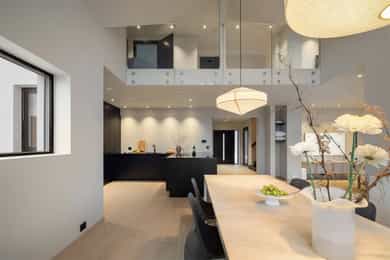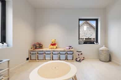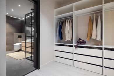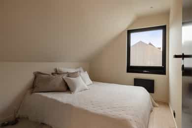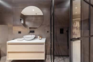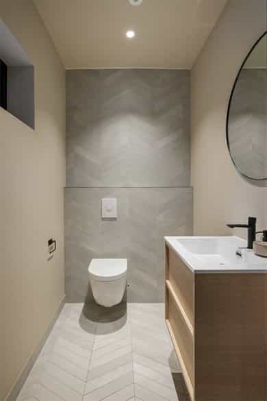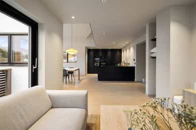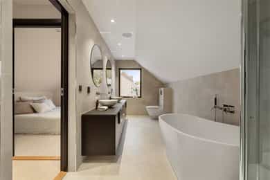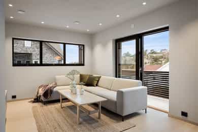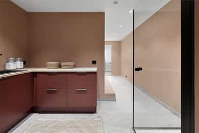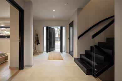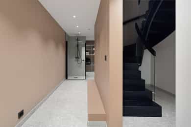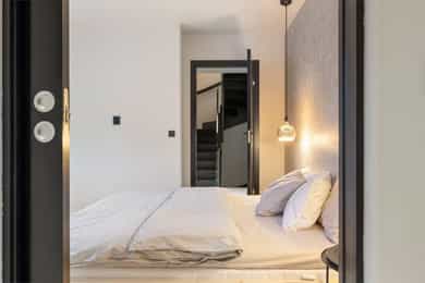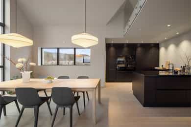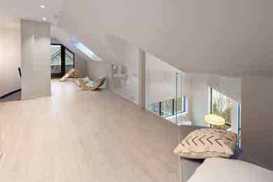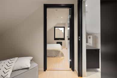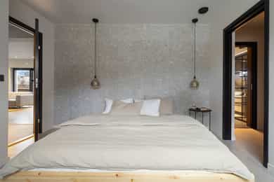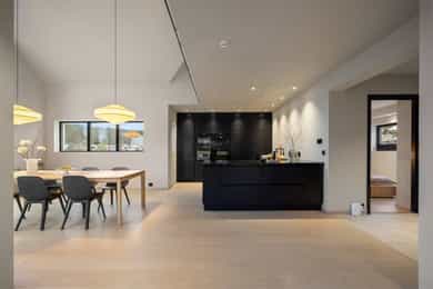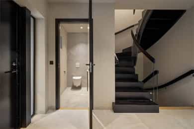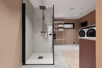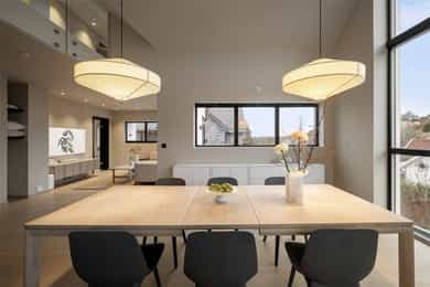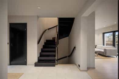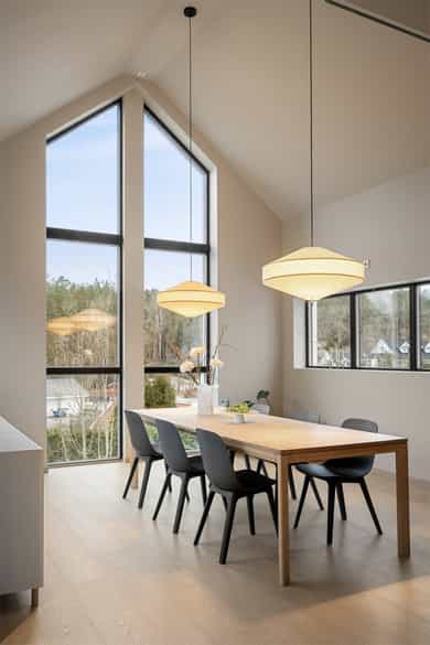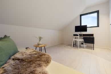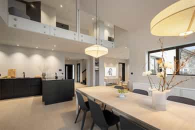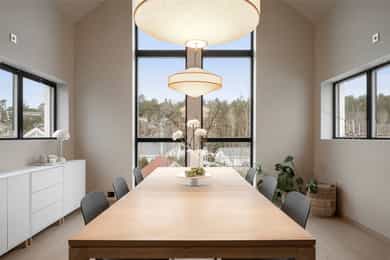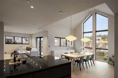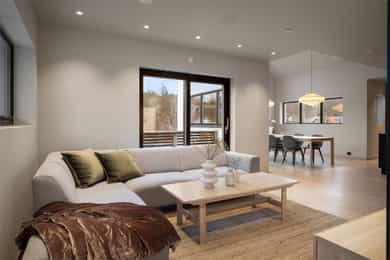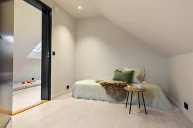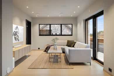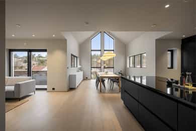 Entreen utstråler varme og balanse. Lyse sandfarger og mørke dører. Du trår på et gulv av lyse naturfliser. Utformingen oser av kvalitet. Fra gangen strekker det seg en siktlinje langt ut i stuen, og det vi ser, gir løfter om en bolig helt utenom det vanlige. Her dominerer en arkitektonisk renhet fri for ornamenter - store flater mot et mykt gulv. Alle rom i første og underetasjen har gulvvarme, og ventilasjonen er balansert. Takene er utstyrt med rikelige downlights, som på kveldstid skaper en god atmosfære. Hovedboligen har fire soverom. På hovedsoverommet kler terrassofliser gavlveggen. Rommet har egen walk-in garderobe, og innenfor ligger et påkostet badeværelse med svært delikate materialvalg og en atmosfære av eksklusivitet. I første etasje finns ogå et toalettrom i entreen. Den åpne stue- og kjøkkenløsningen har tydelig definerte soner, og ferdselen mellom disse flyter naturlig. Spisestuen finner plass der taket løfter seg opp som et kirkerom, helt opp til 4,6 meter. Seks vinduer klatrer oppover sørveggen som en søyle av utsikt og lys, mens sideveggene er kledd med horisontale vinduer. Dette er en spektakulær spiseplass. Kjøkkenet fra HTH hviler mørkt og stilfullt i et hjørne med en kjøkkenhalvøy stikkende ut mot spisestuen. Det er unødvendig å si at det er svært velutstyrt med både vinskap, kaffemaskin, Quoker-kran og stekesone med nedtrekk. Benkeplaten fanger blikket med sin eksklusive reflekterende steinflate. De fleste matelskere drømmer om å få innta et slikt kjøkken. Når du tar trappen opp i 2.etasje, ser du ned på dette fra stuens åpne galleri. En slik kontakt mellom etasjene er med på bidra til en god atmosfære, og åpner kontakten mellom beboerne. Badeværelset her oppe har doble servanter og speil, bred dusjnisje og badekar. Utformingen er perfekt. Nede i underetasjen har alle rom gulvvarme. Her finner du vaskerommet, som også har en praktisk dusj. Helt adskilt finner vi en 3-roms utleieleilighet med egen inngang og en egen hage. Standarden på denne leiligheten er langt høyere en de fleste leiligheten man møter, med nydelig integrert kjøkken, pent bad og i det hele tatt en smakfull utforming.