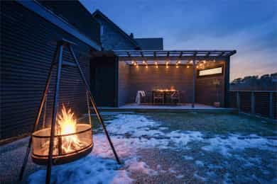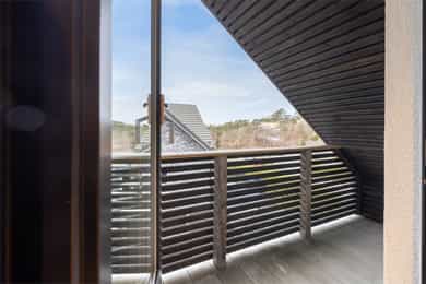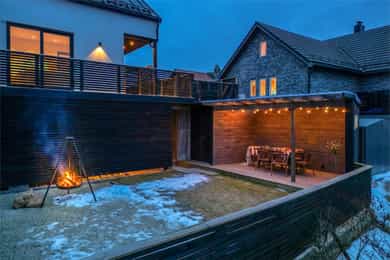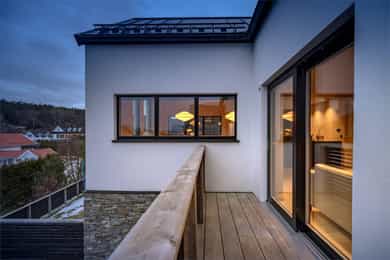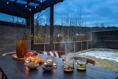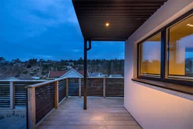 I første etasje utgjør terrassen en forlengelse av gårdsplassen. Den er bygget i vedlikeholdsfri kebony, peker mot sør og vest og har ingenting som skjermer for solen. Utsikten er stor og åpen mot åsryggen lenger borte. I andre etasje finner du en inntrukket balkong med utsikt sørover - et deilig sted å sette seg med en bok om sommeren.
