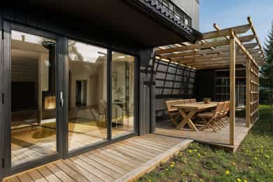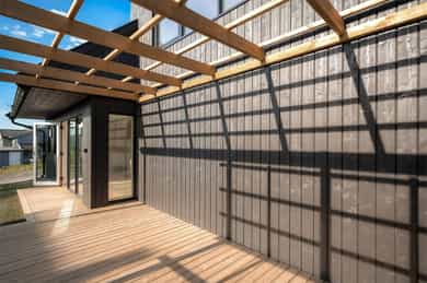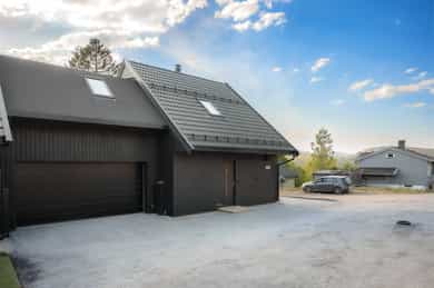 Nyoppført kjedet enebolig over to plan | Ferdigstilt 2024 | Arkitekttegnet | Markterrasse og pergola | Parkeringsplass