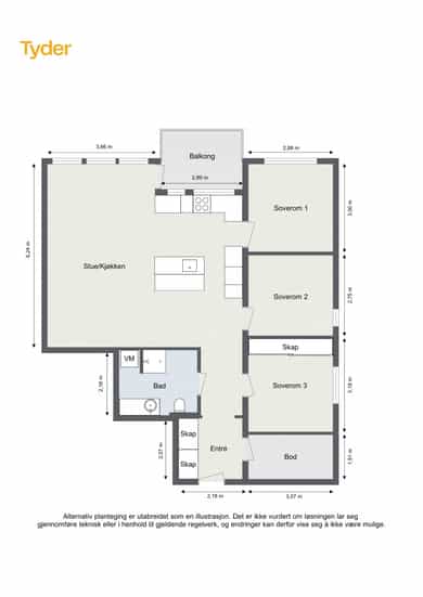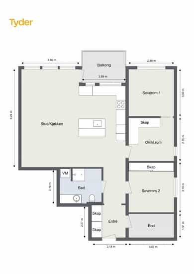 Bad, Entré, Stue/kjøkken, To soverom, Omkledningsrom, Bod. Det gjøres særskilt oppmerksom på at kjellerbod som er medtatt som BRA-e og i totalt BRA ligger på fellesareal, men disponeres av denne leiligheten.