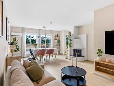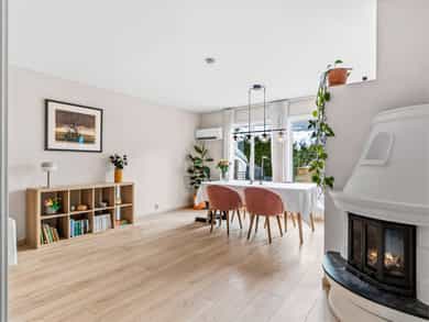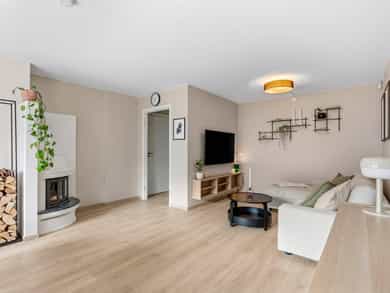 Entré: Velkommen inn! Boligen har et pent inngangsparti fra bakkeplan, med overbygget adkomst. Herfra er det tilgang til en praktisk ekstern bod. Vel inne i entréen er det plass til å henge fra seg yttertøy i knaggoppheng, samt montert skohylle. Hele leiligheten ble oppusset innvendig i 2022-2024, og har fått nye overflater. I tillegg er kjøkken og bad pusset opp, samt satt inn nytt listverk i alle rom. Stue: Videre kommer man inn i stuen. Rommet har store vindusflater som slipper inn rikelig med naturlig lys. I stuen er det plass til stor sofaseksjon, samt tv-møbel. I tillegg er det plass til spisebord. Det er etablert en fin plassbygget elementpeis med glassdør i stuen, samt montert varmepumpe, dette sikrer gode innetemperaturer hele året! Kjøkken: IKEA-innredningen har skap med glatte fronter, samt en laminat benkeplate med nedfelt kum. Det er satt inn stekeovn, platetopp og oppvaskmaskin integrert i innredningen. Det er plass til frittstående kjøle-/fryseskap. Videre er det montert belysning under overskapene. Fra kjøkkenet er det utgang til en sydvendt terrasse på 37 m². Her ute er det god plass til utemøbler, samt gass-/elektrisk grill. Terrassen er fint skjermet med hekk, og er delvis overbygget. Det er ellers etablert hekk som skjermer mot gangveien og gress på siden av boligen. Hekk og gress er fellesareal i sameiet, men dagens eier holder det vedlike. Bad: Badet er også blitt pent pusset opp i 2022. Gulv og vegger er flislagte, og det er varmekabler i gulvet. Rommet har dusjhjørne med dører i herdet glass, veggfestet klosett med innebygget sisterne og opplegg for vaskemaskin. I tillegg er det satt inn servant, og under servanten er det montert et benkeskap med glatte fronter. Tre soverom: Boligen har tre gode soverom. Hovedsoverommet har plass til dobbeltseng med tilhørende nattbord. Videre er det plass til klesoppbevaring i garderobeskap. Soverom nr. 2 og 3 fungerer ypperlig som barnerom, gjesterom eller kontor - her er mulighetene mange. Rommene har plass til seng, nattbord, garderobeløsning og evt. skrivebord. Innvendige overflater: Gulv: Laminatgulv. Fliser på bad. Vegger: Sparklet/pussede og malte overflater. Fliser på bad. Himling: Sparklet og malte plater. Himlingshøyde i stue er målt til 2,45 meter. For full oversikt over tilstandsgrader, se punktet Byggemåte eller se vedlagt tilstandsrapport.