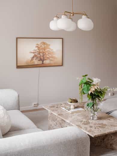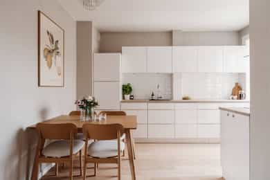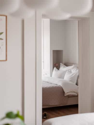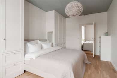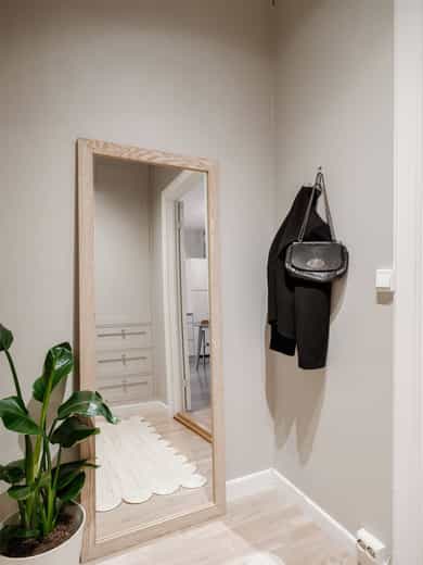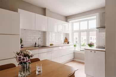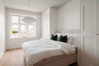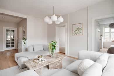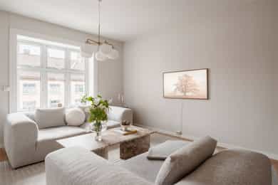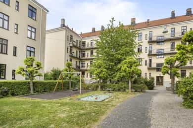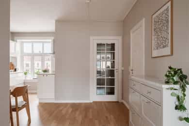 ENTRÉ Vel inne møter du en lys og flott entré som gir et godt førsteinntrykk. Entréen er utstyrt med stort plassbygd garderobeskap, som gir rikelig med oppbevaringsmuligheter. Entréen er malt i delikate farger og har parkettgulv. STUE Nydelig stue med god plass til sofagruppe. Stuen byr på en god takhøyde og store vindusflater som slipper godt inn med naturlig lys. Her får man flott, gjennomgående lys mellom stue og kjøkken. Stuen ble overflateoppusset i 2023 hvor himling, vinduer og listverk ble malt i en hvittone som matcher det ellers delikate fargepaletten. Lyst og fint parkettgulv. Rommet har en flott planløsning som gjør det enkelt å innrede etter eget ønske. I stuen er det et pipeløp mellom dørene til soverommene. KJØKKEN Lekkert kjøkken med god plass til spisebord. Flott KVIK-kjøkken fra 2017 med kvalitets hvitevarer fra Simens. Innredningen består av hvite, glatte fronter, fliser over benken og heltre benkeplate med nedfelt oppvaskkum. Integrerte hvitevarer som platetopp, komfyr, oppvaskmaskin og kombinert kjøle-/fryseskap. Det er tilkoblet kjøkkenventilator med kullfilter over platetoppen. Fra kjøkkenvinduet har du utsikt mot den idylliske bakgården og den flotte brannbalkongen som har plass til et kafésett. Brannbalkongen har adkomst via oppgangen. BAD Pent, flislagt bad fra 2009, med ny innredning i 2022. Innredningen består av servantskap med skuffeseksjon, speil, vegghengt toalett og dusjhjørne med glassdører. Badet er utstyrt med opplegg for vaskemaskin og elektriske varmekabler i gulvet. Varmtvannsberederen er plassert i himlingen og har ett volum på 200 liter og produksjonsår 2008. Naturlig ventilasjon. SOVEROM Leiligheten byr på to gode soverom. Begge soverommene er av god størrelse og byr på god plass til dobbeltseng og tilhørende møblement. De store vindusflatene slipper godt inn med naturlig lys. Soverommene er utstyrt med store plassbygde garderobeskap og kommoder som gir rommene gode oppbevaringsmuligheter. Rommene har flere bruksmuligheter som gjesteværelse, barnerom, kontor eller tv-stue. Begge rommene er overflateoppusset i 2023 med delikate fargetoner. INNVENDIGE OVERFLATER: Gulv: Innvendige gulv er belagt med trestavs parkett. Vegger: Sparklet og malte overflater på plater/murpuss. Himling: Sparklet og malte plater. Himlingshøyde ca. 2,72 m målt i kjøkken.