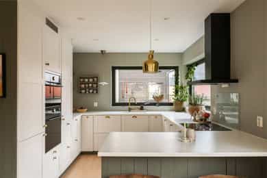 Innvendige overflater: - Gulv: Parkett og fliser. - Vegger: Sparklet/pussede og malte overflater. - Himling: Sparklet/pussede og malte overflater. Himlingshøyder: Kjeller: Himlingshøyden målt til ca. 2,45 meter i kjellerstuen. 1. etasje: Himlingshøyden målt til ca. 2,41 meter i stuen. 2. etasje: Himlingshøyden målt til ca. 2,45 meter i soverom. Kjøkkeninnredning: 1. etasje: Kjøkkeninnredning med profilerte fronter og nedfelt kum i plastkompositt. Oppvaskmaskin, platetopp, stekeovner og kjøleskap er integrert i innredningen. Kjeller: Kjøkkeninnredning med profilerte fronter og nedfelt kum i stål. Platetopp, stekeovn og kjøkeskap er integrert i innredningen.