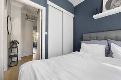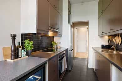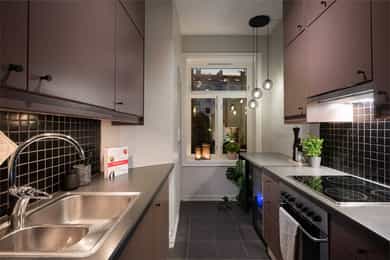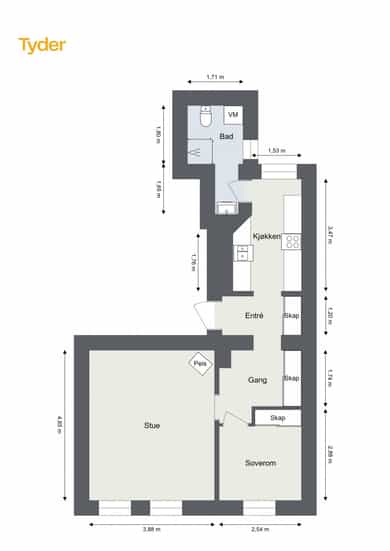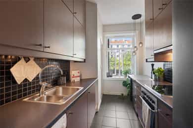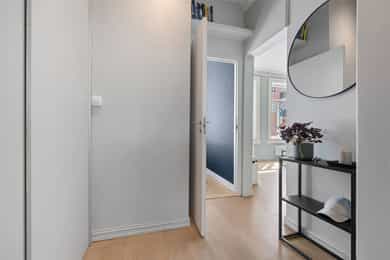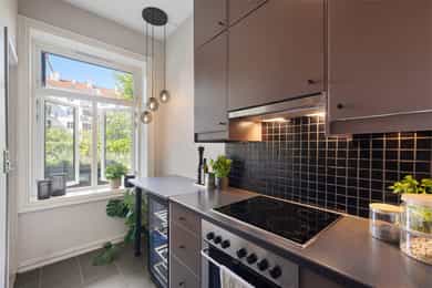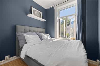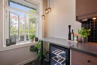1.etasje, 47 kvm BRA-I: Entré, gang, stue, kjøkken, bad og soverom. Leiligheten ligger i en høy første etasje og er gjennomgående. Boligen vender delvis ut mot frodig bakgård. Entré Velkommen inn! I leiligheten blir du møtt av en flislagt entré med plass til å sette fra seg sko og henge fra seg yttertøy. Det er montert 2 stk. garderobeløsninger for ekstra lagringsplass med skyvedører. Stue Lys og luftig stue med store vindusflater og generøs takhøyde på nesten 3 meter! Her får man godt bevarte, klassiske elementer som rosett, stukkatur og vinduer med dype karmer. Stuen har pene overflater med trestavs parkettgulv, malte vegger og himling. I hjørnet av stuen er det plassert en flott peisovn som varmer godt på kalde vinterdager. Stuen er romslig og har god plass til både sofa og spisebord. Kjøkken Leilighetens kjøkken ligger separat til fra stuen. IKEA-kjøkkeninnredning fra 2007/08 bestående av glatte fronter og laminat benkeplate med nedfelt kum i rustfritt stål. Det er lagt fliser på vegg over benkeskap og belysning under overskap. Kjøkkenet er utstyrt med integrert stekeovn og kermaisk topp, samt opplegg for oppvaskmaskin. Kjøkkenet har godt med skap- og benkeplass. Rommet vender mot en luftig bakgård og grøntarealer. Bad Flislagt bad med varmekabler og opplegg for vaskemaskin. Baderomsinnredningen består av benkeskap med glatte fronter og veggskap med speilfronter og belysning over servant. Badet er utstyrt med dusj med innfellbare dører i herdet glass, servant og gulvstående klosett. Soverom Romslig soverom med god plass til dobbeltseng og nattbord. Lagringsplassen er godt ivaretatt i garderobeskap med skyvedører. Boder Leiligheten disponerer to boder, hvorav én bod i kjeller på ca. 5 kvm og én bod på loftet på ca. 1 kvm.