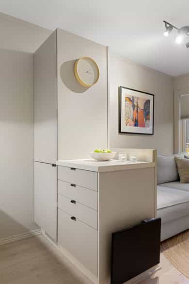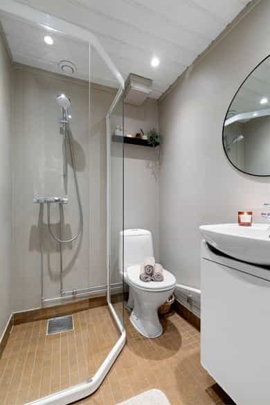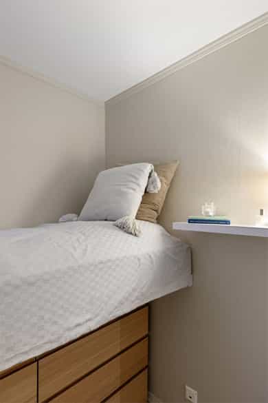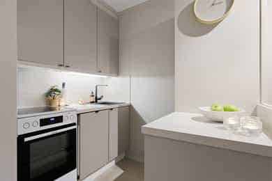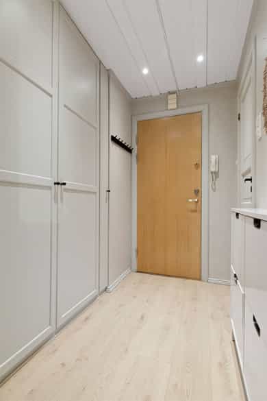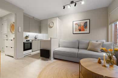 Entré Innbydende entré med plass til anheng av klær og sko. Rikelig med lagringsplass i medfølgende garderobeskap. Kjøkken/stue Kjøkkenet er av typen Epoq fra 2024. Kjøkkeninnredningen består av spon, slette skapfronter med over- og underskap som gir god oppbevaringsplass. Benkeplaten er laminert og det er montert nedfelt rustfri oppvaskkum med avrenningsfelt. Veggen over benk er flislagt. Det er integrerte hvitevarer, herunder kjøl/fryseskap og oppvaskmaskin, med frittstående komfyr. I forlengelsen av kjøkkenet finner vi en lys og åpen stueløsning med plass til hyggelig frokost-/spisebord og sofagruppe. Rommets løsning byr på naturlige møbleringsalternativer. Alkove Effektiv alkoveløsning med opphøyd seng, hvilket frigjør godt med lagringsplass under. Rommet har ellers plass til skrivebord/hjemmekontor og vindu gir godt med naturlig lys. Baderom Badet er fra byggeår og er bygget i henhold til den tekniske forskriften TEK97 som var gjeldende på byggingstidspunktet. Overflatene på vegger er våtromstapet og gulv er flislagt, mens taket er av malt trepanel. Badet er innredet med en servant, overhengende speil og belysning. Dusjen er plassert i hjørnet og har håndholdt dusjarmatur. Videre er det montert et gulvstående toalett. Tekniske installasjoner Innvendige vannledninger er av kobber. Synlige avløpsrør er av plast. Leiligheten har naturlig ventilasjon via ventiler i vegg. Sikringsskap plassert i felles gang, utstyrt med automatsikringer, strømmåler og kursfortegnelse. Lovpålagt røykvarsler/brannslukningsutstyr medfølger.