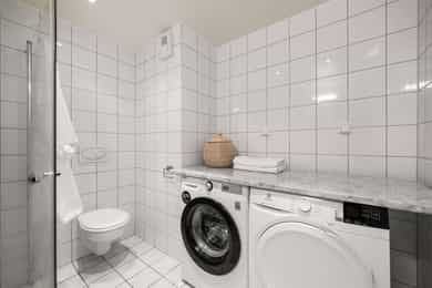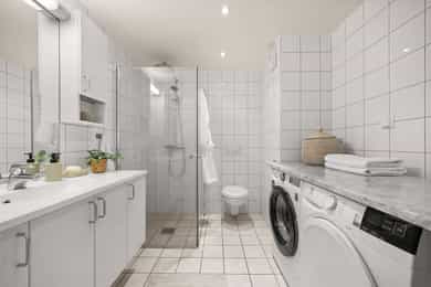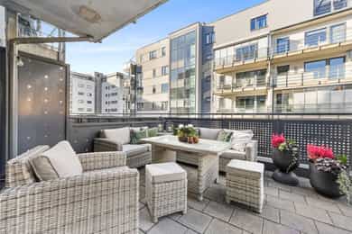 Hall/gang: Velkommen hjem! Romslig gang med godt med lagringsplass. Leiligheten har egen inngang fra bakgård. Stue/kjøkken: Fra hall kommer man inn til en åpen stue-/kjøkkenløsning av god størrelse. Kjøkkenet har en Norema innredning fra byggeår med malte slette fronter og laminat benkeplate. Kjøkkenet er utstyrt med 1 1/2 kum og standard kjøkkenbatteri. Hvitevarer som ovn, koketopp og kombiskap med integrert frys er integrert i innredningen. Det er også en frittstående oppvaskmaskin under benk og et ekstra frittstående kjøleskap. Disse medfølger salget. God plass for spisestue i tilknytning til kjøkken. Stuen har god plass for generøs innredning med sofa og tilhørende tv-møblement. Fra stuen er det utgang til en meget romslig veranda med flott ettermiddags- og kveldssol. Verandaen er delvis takoverbygget og har gode møbleringsmuligheter. Bad: Flislagt baderom med gulvvarme. Badet er utstyrt med en innredning med slette fronter, enkel heldekkende servant, speil og standard blandebatteri. Videre er det et vegghengt toalett med innebygd sisterne og et dusjhjørne med svingdører. Badet har mekanisk avtrekk. Soverom: Leiligheten har to fine soverom som er nymalte. Begge rommene har klesoppbevaring, og god plass for seng med tilhørende nattbord.