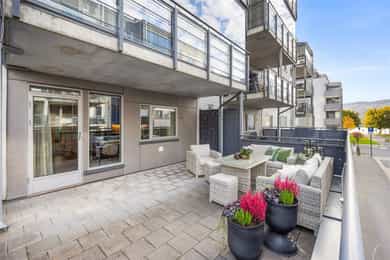 Romslig 3-roms eierleilighet med terrasse på hele 36 kvm - 2 soverom - Garasje m/lader - Elveutsikt - Trappefri adkomst