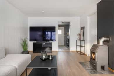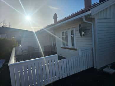 Lys og velholdt halvpart på hjørnetomt med garasje, terrasser og lave bokostnader - To soverom - Peis - Hage.