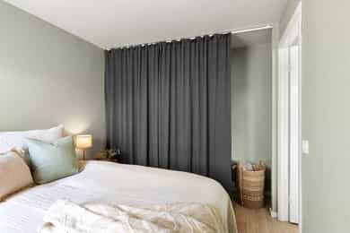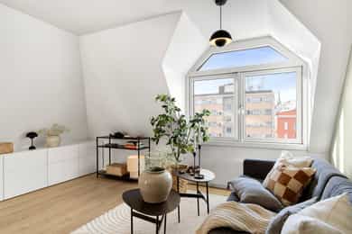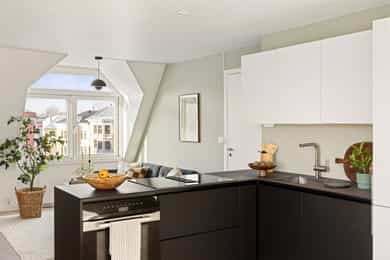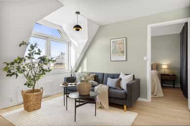 Entré: En hyggelig entré med plass til oppheng av yttertøy og sko. Her finner du også boligens porttelefon. Åpen stue/kjøkkenløsning: Delikat stue med plass til sofagruppe og øvrig møblement. Rikelig med lysinnslipp fra balkongdør og vinduer, som er nye fra 2024. Det er også naturlig plass til spisebord, perfekt for hyggelige måltider med venner og familie. Det åpne kjøkkenet skaper en naturlig deling av spisestue og sofagruppe. Lekkert og moderne HTH-kjøkken med Miele-hvitevarer og ny varmtvannsbereder montert i 2019. Tidsriktig innredning med glatte fronter og benkeplate i laminat. Nedsenket oppvaskkum med ettgreps blandebatteri. Det er integrert oppvaskmaskin, kjøl/fryseskap, platetopp og stekeovn. Platetoppen har en integrert kullfiltervifte. Balkong: Fra kjøkkenet er det utgang til en sørøstvendt balkong på 4 kvm. Her er det plass til sittemøblement og beplanting. Her bor du høyt og fritt i byggets 6. etasje uten innsyn eller sjenerende gjenboere. Nyt den åpne og flotte utsikten over byen. Bad: Eldre baderom med gulvvarme. Badet er innredet med dusjhjørne, wc og servant. Fliser på gulv og vegger, mens himlingen har malt overflate. Mekanisk avtrekk bidrar til godt inneklima og det er opplegg for vaskemaskin. Soverom: Soverommet har god plass til dobbeltseng og garderobeskap.