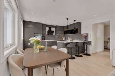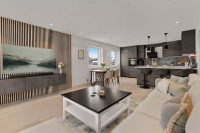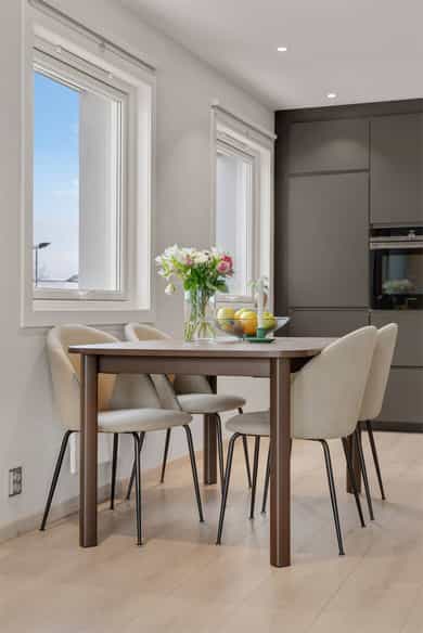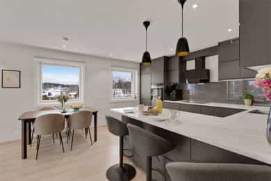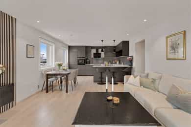 Jonas Dahlén har gleden av å presentere St Hansveien 3! En moderne og gjennomført hjørneleilighet med svært god planløsning som gir rom for både hverdagsliv og sosialt samvær. Romslig og stilrent kjøkken i åpen løsning mot stue, med god skap- og benkeplass samt naturlig plass for spisebord. Store vindusflater gir rikelig med lysinnslipp og en luftig atmosfære.
