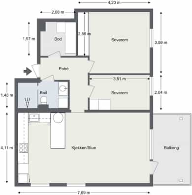 Kjøkken: Leiligheten har en moderne og åpen kjøkken- og stueløsning med gode lysforhold og en funksjonell planløsning. Kjøkkenet har glatt, laminert kjøkkeninnredning med laminert benkeplate, kum med ettgreps blandebatteri samt integrerte hvitevarer bestående av stekeovn, kjøl/frys og oppvaskmaskin. Det er integrert koketopp med kullfiltervifte over, og kjøkkenøy som gir ekstra arbeidsflate og sitteplasser. Stuen oppleves som romslig og innbydende med god plass til både sofagruppe og spisebord. Fra stuen er det utgang til en balkong på ca. 9 kvm, som gir fine muligheter for utemøblering og hyggelige uteopphold. Leiligheten har sol fra ettermiddag til kveld og lite innsyn. Bad: Pent og flislagt bad som ble pusset opp i 2021 i regi av tidligere eier. Badet er moderne og delikat med veggmontert WC, dusjplass med dusjvegger samt servant med ettgreps blandebatteri og tilhørende innredning. Det er opplegg for vaskemaskin, som gir en praktisk og funksjonell baderomsløsning. Soverom: Leiligheten har to soverom med gode størrelser og behagelige lysforhold. Hovedsoverommet har god plass til dobbeltseng og er utstyrt med skyvedørsgarderobe som gir rikelig med oppbevaringsplass. Det andre soverommet egner seg godt som barnerom, gjesterom eller hjemmekontor, og har garderobeskap. Entré og bod: Velkommen inn! Her har du en stor og romslig gang med flislagt gulv med varmekabler og god glass i skap eller skjenk. I tilknytning til gangen har du en praktisk innvendig bod med gode oppbevaringsmuligheter. Overflater: Gulv: Laminat og fliser med gulvvarme i entré og på bad. Vegger: Malte flater i alle rom. Himling: Malte flater i alle rom. Takhøyde er målt til 2,39 meter i stuen. Downlights med dimmer i entré og på stue/kjøkken.