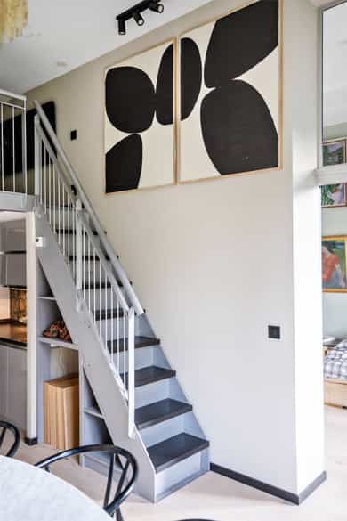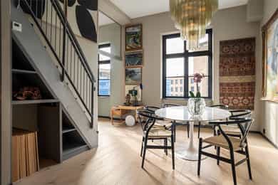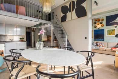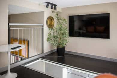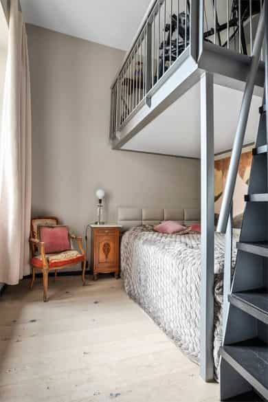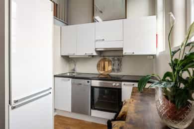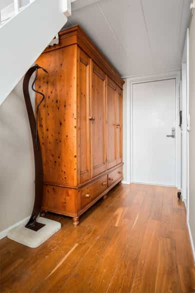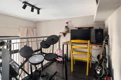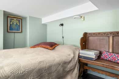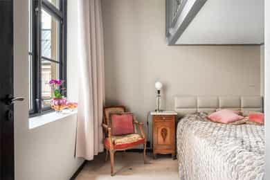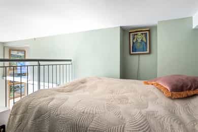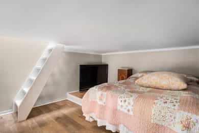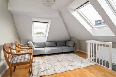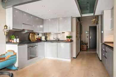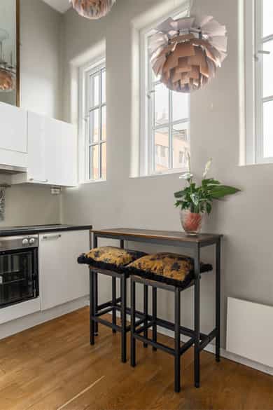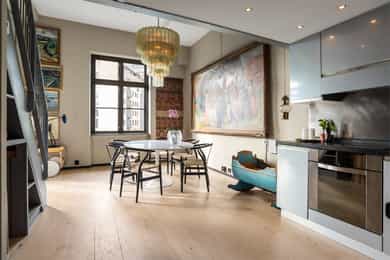 Hoveddel: Entré: Velkommen inn i leiligheten. Entréen gir et godt førsteinntrykk og har god plass til oppheng av yttertøy og sko i en praktisk skyvedørsgarderobe. Boligen har balansert ventilasjon og et oppgradert elektrisk anlegg fra 2025. Spisestue og kjøkke: Fra entréen åpner boligen seg mot en romslig og åpen løsning med kjøkken og spisestue. Spiseområdet har en imponerende takhøyde på ca. 3,60 m som gir en luftig og innbydende romfølelse. Enstavs parkett, lagt i 2021, gir et moderne og helhetlig uttrykk. Kjøkkenet har stilrene, glatte fronter, laminat benkeplate med nedfelt kum i rustfritt stål og stålplater på vegg over benk. Det er integrerte hvitevarer bestående av induksjonstopp, stekeovn, oppvaskmaskin samt kjøl og frys. Over kjøkkenet er det en praktisk hems med ca. 2,05 m takhøyde under som i dag fungerer som TV-stue. Stue/ soverom: Stuen er adskilt fra spisestuen med skyvedør og byr på en imponerende takhøyde på ca. 3,60 m som gir en luftig og behagelig atmosfære. Gulvet er belagt med enstavs parkett og rommet har vannbåren gulvvarme for ekstra komfort. Den gode takhøyden er smart utnyttet med en hems med ca. 1,60 m takhøyde, mens det er ca. 1,90 m under hemsen. Fra stuen er det adkomst til en praktisk walk-in garderobe, diskret skjult bak skyvedør med speilfront. Soverom 2: Leilighetens andre soverom har svært god takhøyde på ca. 3,62 m som gir en luftig og behagelig romfølelse. Rommet har enstavs parkett og vannbåren gulvvarme. Takhøyden er effektivt utnyttet med en hems med ca. 1,65 m takhøyde, og ca. 1,90 m under hemsen. Bad: Badet i hoveddelen ble etablert i 2006 og overflateoppusset i 2021. Gulv og vegger er utført i mikrosement som gir et stilrent uttrykk. Innredningen består av benkeskap med glatte fronter, speil over servant og åpne trehyller over opplegg for vaskemaskin. Dusjsonen har innfellbare dører i herdet glass, og toalettet er vegghengt med innebygget sisterne. Badet har vannbåren gulvvarme og avtrekk via balansert ventilasjon. Sekundærdel (Denne delen er byggemeldt som bod): Entré Sekundærdelen har egen inngang i 3. etasje. Entréen har enstavs parkett på gulv og en takhøyde på ca. 2,09 m under hemsen. Rommet har vannbåren gulvvarme og egen sikringstavle med automatsikringer og jordfeilbryter. Kjøkken: Kjøkkenet har en imponerende takhøyde på ca. 3,64 m og enstavs parkett på gulv. Innredningen har glatte fronter og laminat benkeplate med nedfelt kum. Det er integrerte hvitevarer bestående av stekeovn, keramisk topp samt kjøl og frys, i tillegg til opplegg for oppvaskmaskin. Rommet har kullfilterventilator og oppvarming med både panelovn og vannbåren gulvvarme. Fra kjøkkenet er det adkomst til hems med gulvareal på ca. 13 kvm. Bad: Badet ble etablert i 2006 og har flislagte gulv og vegger samt malt trepanel i himlingen. Innredningen består av benkeskap med servant og speil. Det er dusj på gulv, gulvstående klosett og opplegg for vaskemaskin. Badet har vannbåren gulvvarme og avtrekk fra ventilasjonsanlegget. Loftsstue: En intern trapp leder opp til loftstuen i 4. etasje. Rommet har et gulvareal på ca. 18 kvm og enstavs parkett på gulv. Skråhimlingen gir varierende takhøyde fra ca. 0,65 m til 3,69 m, og her er det god plass til sittegruppe med tilhørende møblement. Loftstuen har vannbåren gulvvarme.