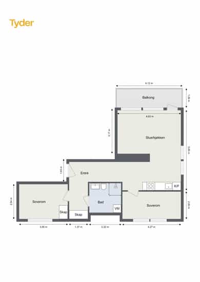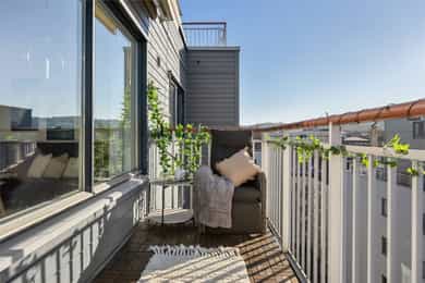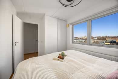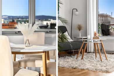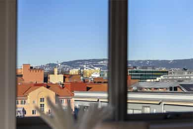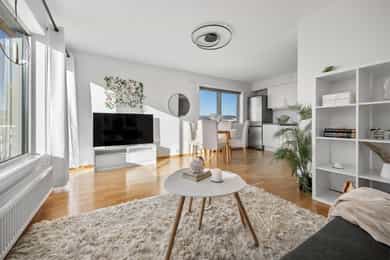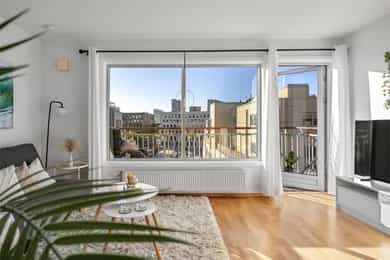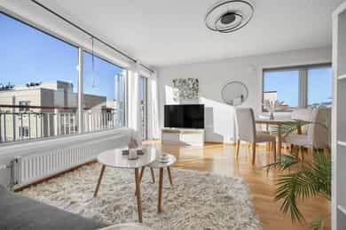 Gjennomgående toppleilighet med solrik og luftig balkong | Heis | V.v. og fyring ink | Endeleilighet | Sentralt | Utsikt