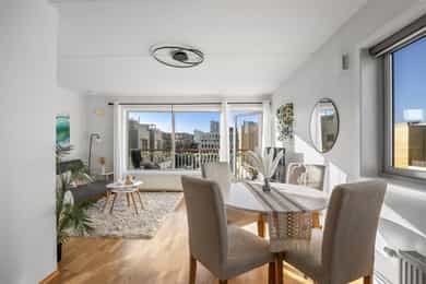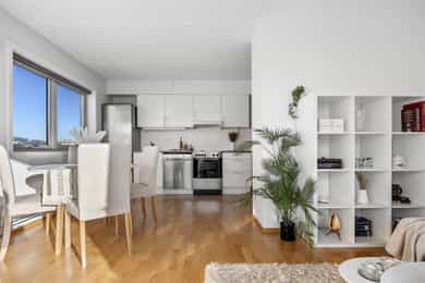 Velkommen til denne flotte toppleiligheten i Teaterkvartalet, presentert av Nordvik v/André Rosensten Leiligheten er gjennomgående, beliggende høyt og fritt i byggets øverste etasje, med store vindusflater og god utsikt. Det er to gode, svale soverom og åpen kjøkken/stue-løsning.