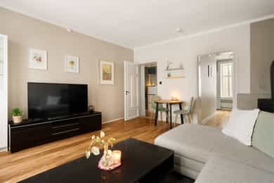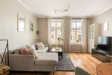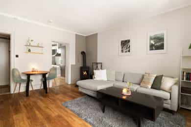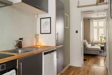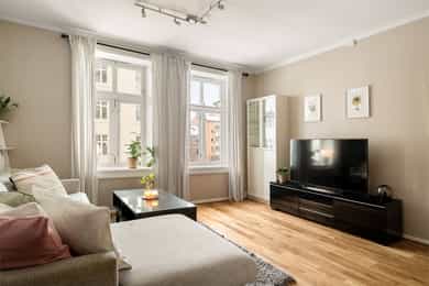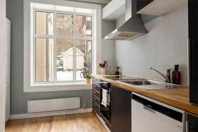 Pen og praktisk 3-roms med sentrumsnær og attraktiv beliggenet. Ingen fellesgjeld eller dok.avgift. TG1 kjøkken.