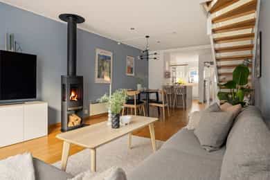 Lekkert enderekkehus o/to plan fra 2013| Vedovn |3 gode soverom | Garasje m/EL |Solrike uteplasser | Markanært