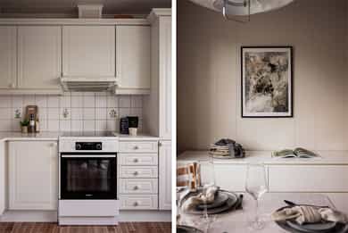 Det er morgensol på kjøkkenet og ettermiddag/kveldssol på terrassen.