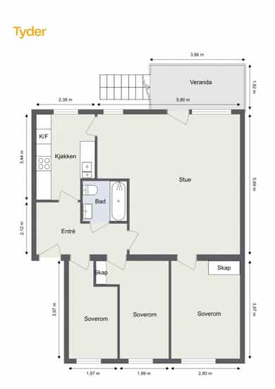 BRA-i: 78 kvm. Entré, bad, kjøkken, stue og tre soverom