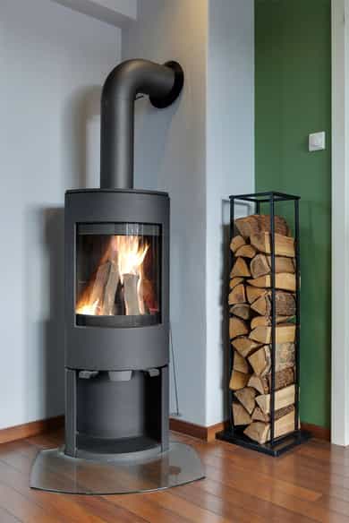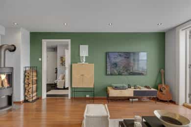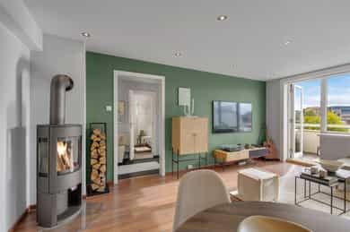 Boligen blir oppvarmet med elektrisitet og vedfyring.