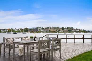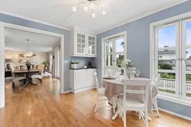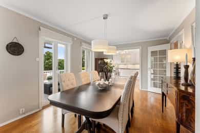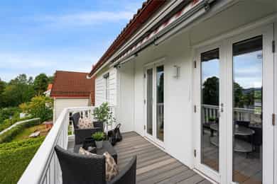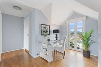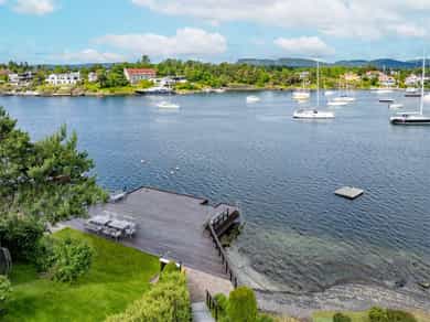 Sjønær, solrik enebolig på høydedrag. Fjordutsikt to sider. Bøye for båt, privat brygge/strandlinje! Utleiedel.