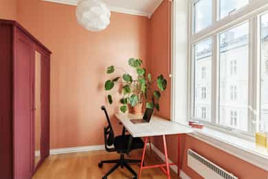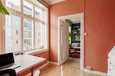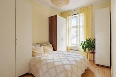 ENTRÉ Leiligheten ligger i byggets 3. etasje. Entré med plass til ytterjakker og sko. Inngang til de fleste rom fra gangen. Sikringsskap med automatsikringer. Sikringsskapet er plassert i oppgang en halv etasje opp. Stoppekran er i kjelleren. KJØKKEN Leiligheten har et romslig og separat kjøkken med plass til spisebord. Stort vindu mot indre gårdsrom. Kjøkkeninnredning med stein benkeplate med nedfelt oppvaskkum med 1-greps blandebatteri. Skylleplate mellom over og underskap. Det er montert en integrert oppvaskmaskin, integrert komfyr og nedfelt platetopp og det er tilkoblet en ventilator over kokeplass. Enkelte fronter ble byttet på kjøkken i 2025. STUE Stuen er leilighetens "hjerte". Her har man to store vindusflater som slipper inn godt med naturlig lys, en generøs takhøyde på opp mot 3 meter og peis. Rommets størrelse gir plass til både sofagruppe og spisebord, samt diverse oppbevaringsmøbler og TV. Stue, kjøkken, gang og soverom ble malt i 2020. Laminat på gulv. HOVEDSOVEROM Stort hovedsoverom som vender mot bakgård. God plass til dobbeltseng, nattbord, garderobeskap og skrivebord hvis ønskelig. Soverommet ble malt i 2025, samtidig ble også yttervegg isolert. Originalt tregulv. SOVEROM II / KONTOR Dette rommet har selger tidligere brukt til et soverom, men nå er det innredet som kontor/gjesterom. Rommet har flere bruksmuligheter etter hva som er behov. Vindu vender mot Kingos gate. Også dette rommet har generøs takhøyde og stort vindu. BAD Bad med fliser på gulv og vegger. Innredningen består av et underskap/overskap, servant, speil, lys, stikk og en dusjsone med dusjing direkte på gulv og vegg. Opplegg for vaskemaskin og det er tilkoblet et vannklosett. Naturlig ventilasjon. I følge selger ble badet pusset opp i 2012.