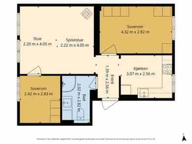 Arealene er oppmålt på stedet på best mulig måte med laser. På grunn av møbler/ innredning kan det forekomme avvik på deler av oppmålingen da noen mål er tatt høyere opp på veggen enn anbefalt. Vegger kan være skjeve og kan gi andre mål enn ved måling langs gulvet.