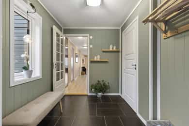 BRA-i: 90 kvm. Stue, kjøkken, bad, vaskerom, ett soverom, bod og vindfang.