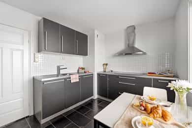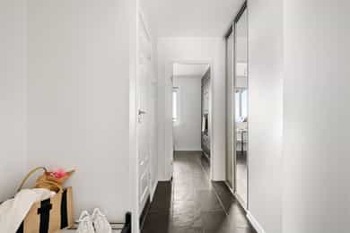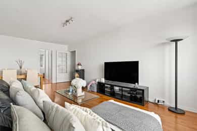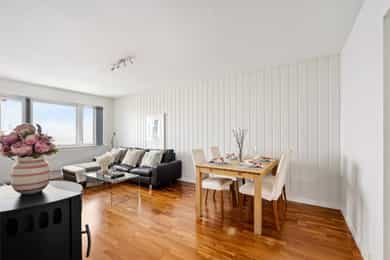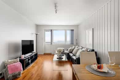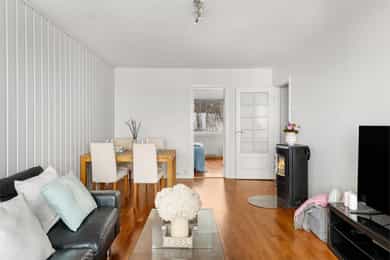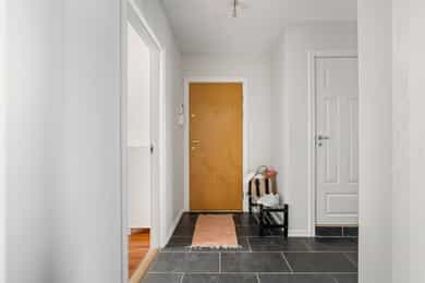 Entré Velkommen inn i en innbydende entré med god plass til å henge fra seg yttertøy og sko. Entréen er praktisk utformet med skyvedørsgarderobe som gir rikelig med oppbevaringsplass og bidrar til et ryddig og organisert inngangsparti. Leiligheten har adkomst fra felles trappeoppgang, og fra entréen er det direkte tilgang til bad, stue og kjøkken samt ett av leilighetens to soverom. Stue Den romslige stuen fremstår lys og luftig med store vindusflater som slipper inn rikelig med naturlig lys. Rommets utforming gjør det enkelt å møblere etter egne ønsker og behov, og stuen deles naturlig inn i en hyggelig sofagruppe med TV sone og en egen spiseplass. Her ligger alt til rette for både avslappende hverdager og sosiale sammenkomster. Fra stuen er det utgang til en vestvendt balkong på hele 8 kvm. Balkongen byr på svært gode solforhold og en flott, åpen utsikt, som må oppleves! Et perfekt sted å nyte ettermiddags og kveldssolen i rolige omgivelser. Dette er en kvalitet som virkelig skiller boligen ut. Kjøkken Kjøkkenet har en stilren innredning med finerte, mørkegrå fronter og laminat benkeplate, kombinert med fliser over benk som gir et helhetlig uttrykk. Innredningen ble montert i 2006 fra KVIK, med senere oppgraderinger av stekeovn i 2018 og induksjonstopp i 2023. Kjøkkenet er utstyrt med integrert oppvaskmaskin, kjøl og fryseskap, stekeovn, induksjon platetopp, hetteventilator og underlimt oppvaskkum. Her er det godt med både skap og benkeplass, noe som gir gode arbeidsforhold for matlaging. Det er også plass til en hyggelig, mindre spisegruppe ved vinduet, perfekt for frokost, en rask lunsj eller dagens første kaffekopp. Bad Pent og funksjonelt bad. Badet er innredet med veggmontert toalett, dusj med herdet glassdører, baderomsinnredning med finert front og laminat benkeplate med overliggende servant, samt veggspeil med belysning. Det er opplegg for vaskemaskin, noe som gjør hverdagen både enkel og effektiv. Soverom Leiligheten har to gode soverom med fleksible bruksmuligheter. Hovedsoverommet har god plass til dobbeltseng, nattbord og øvrig møblement, og er utstyrt med en romslig skyvedørsgarderobe som gir svært gode oppbevaringsmuligheter. Soverom nummer to egner seg ypperlig som barnerom, gjesterom eller hjemmekontor, et allsidig rom som enkelt kan tilpasses ulike behov og livsfaser. For ekstra oppbevaring disponerer leiligheten en kjellerbod på 6 kvm og en loftsbod på 2 kvm med 9 kvm gulvareal.