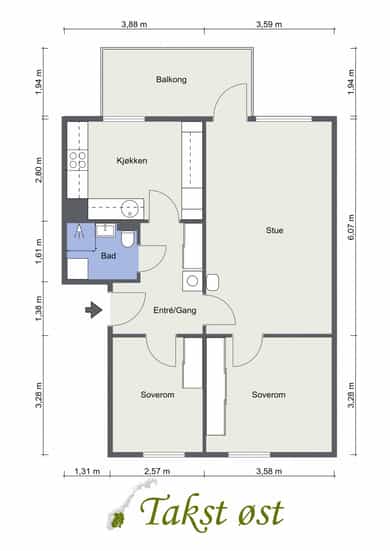 BRA-i: 67 kvm. Entrè/gang, bad/vaskerom, 2 soverom, stue og kjøkken.