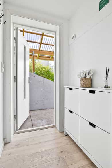 Entré, to soverom, bad, stue og kjøkken. Innvendig og utvendig bod.