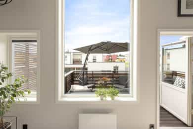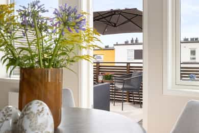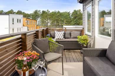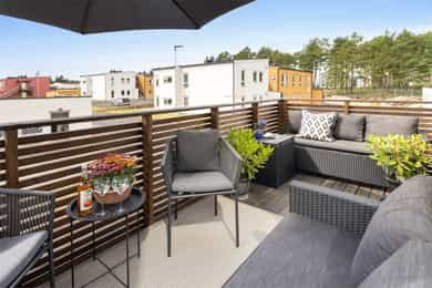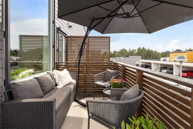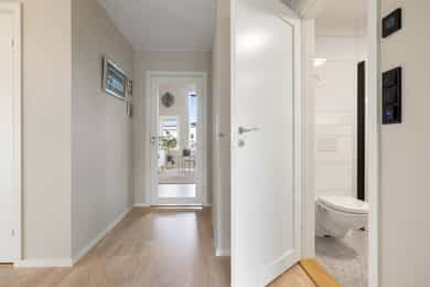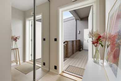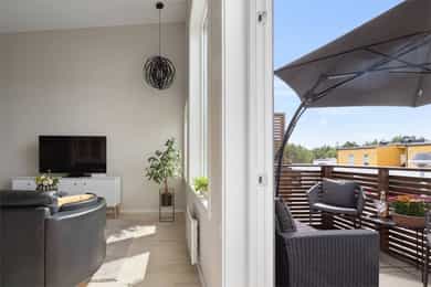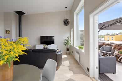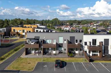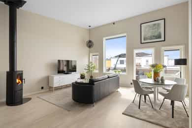 Påkostet 3-roms ende-leilighet med naturen som nabo. Sørvest-vendt balkong m/motorisert markise. Carport m/el.billader.