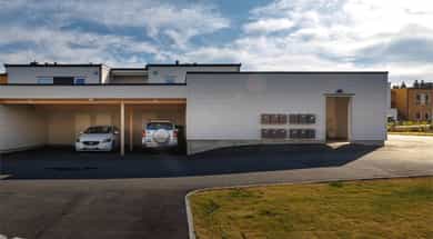 Parkering i carport-anlegg med bod i bakkant. I tillegg har sameiet 16 stk parkeringsplasser og 8 stk HC-plasser på fellesareal.