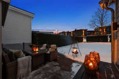 Den sørvestvendte terrassen og hagen er perfekt plassert for å fange opp solstrålene fra formiddagen til sent på kveld, noe som gjør uteområdet til en fantastisk plass for grilling og sosiale sammenkomster. Det er morgensol foran huset ved inngangspartiet. Fra ca. kl. 12.00 er det sol på baksiden av huset til ca. kl. 20.30-21.000 på sommeren i hht. informasjon fra selger.