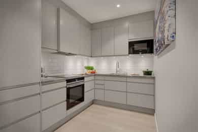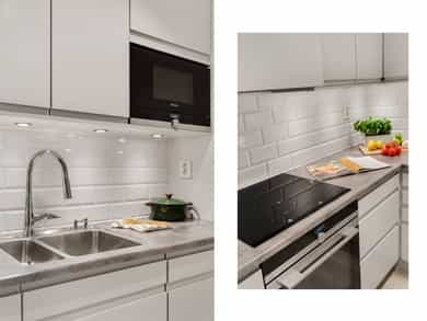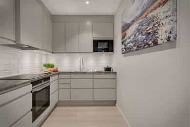- Flislagt over kjøkkenbenk og opp til skap