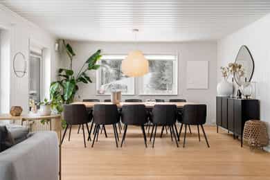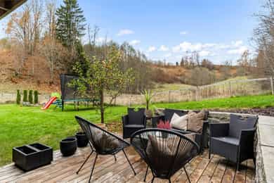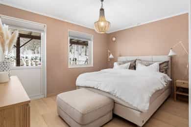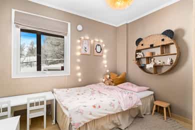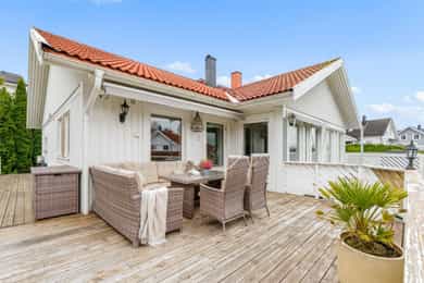 Attraktiv og familievennlig halvpart av tomannsbolig. Innerst i blindevei. Garasje. Store vestvendte uteplasser