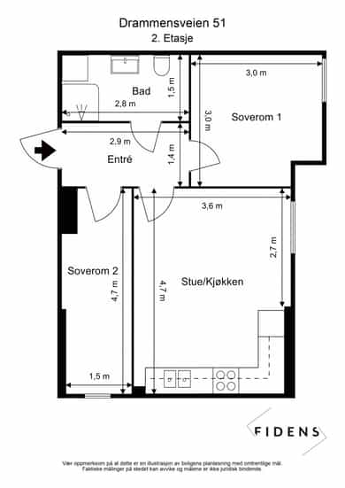 BRA-i: 43 kvm. Entre, bad, 2 soverom, stue/kjøkken.