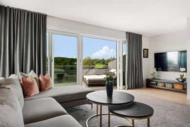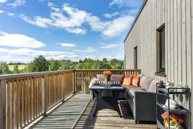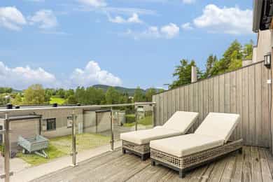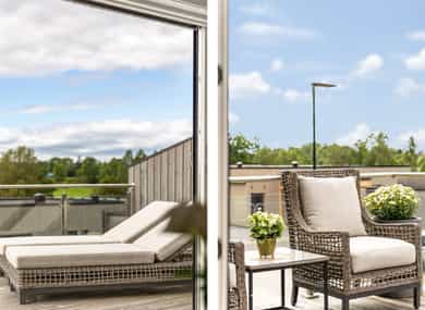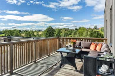 Det er svært gode solforhold fra tidlig morgen til sen kveld. Det er terrasser og verandaer mot syd og vest, hvor man kan nyte de særdeles gode solforholdene og fantastisk utsikt mot hyggelig gårdslandsskap i vest.