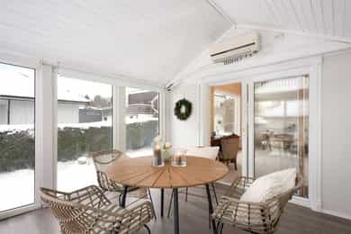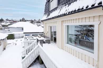 Selger opplyser: Solen kommer tidlig rundt 07.00 ved inngangspartiet i sommerhalvåret og følger rundt til veranda og hage der den forsvinner i 22.30 tiden. Her nyter vi solen hele dagen fra tidlig til sent.