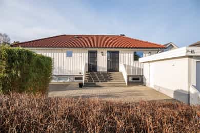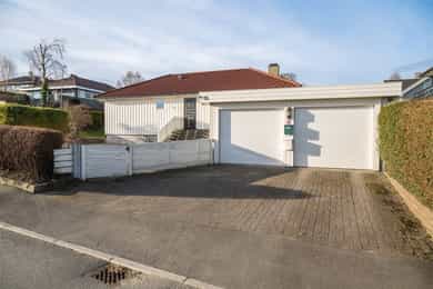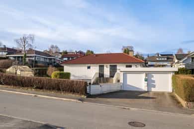 Enebolig over to etasjer med hybel, dobbel garasje, gode solforhold og beliggende i familievennlig område.