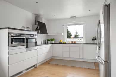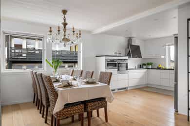 Skiftet dører, lagt parkett og skiftet kjøkken. Nye terrassebord, ny kjeller og garasjedør, og nye garasjeporter.