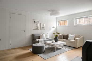 Entréen ønsker deg velkommen til en lys og romslig gang med fliser på gulv og stort garderobeskap. Vegg i vegg ligger boligens praktiske biinngang med vaskerom – en svært funksjonell løsning, særlig for barnefamilier. Vaskerommet er godt utstyrt med innredning, rikelig skapplass og opplegg for både vaskemaskin og tørketrommel. I første etasje finner du også et gjestetoalett med servant og toalett. Etasjen rommer tre soverom samt et helfliset bad med varmekabler i gulv. Badet er innredet med dobbel servant i seksjon, høyskap, frittstående badekar med dusjmulighet og toalett. Oppholdsrommene er lyse og romslige, med en åpen og behagelig atmosfære. Stuen er innbydende og generøst dimensjonert, med god plass til både stor sofagruppe og langbord i naturlig definerte soner. Store vindusflater gir rikelig med dagslys og en luftig romfølelse. På kjøligere dager sørger vedovn og varmepumpe for effektiv og behagelig oppvarming. Fra stuen er det direkte utgang til en stor, solrik terrasse med god plass til spisegruppe, grill, loungemøbler og beplantning. Den romslige hagen er pent opparbeidet og gir et trygt og hyggelig uteområde for både små og store. Kjøkkenet ligger delvis adskilt fra stuen og har rikelig med skap- og benkeplass. Her er det integrerte hvitevarer som platetopp og stekeovn, samt god plass til et romslig spisebord som samler familien. I kjelleretasjen finnes flere bod- og hobbyrom, samt et innredet bad. Badet var opprinnelig tiltenkt bod på byggetegningene – se nærmere informasjon under punkt ferdigattest. Etasjen byr på fleksible rom som egner seg godt til TV-stue, lek eller hjemmekontor. Videre i kjelleren er det innredet hybel med entré/gang, to soverom, bad/vaskerom og stue med åpen kjøkkenløsning. Hybelen har egen inngang samt intern adkomst til resten av boligen. Boligen har romslig dobbel garasje og gode parkeringsmuligheter på egen tomt. Innvendig: Kjeller. Fliser og parkett på gulv. MDF plater og malte flater på vegg. Malt tak. 1 Etasje. Fliser og parkett på gulv. Tak takplater 30 X 180 og malte flater. Malt vegg.
