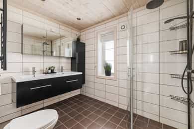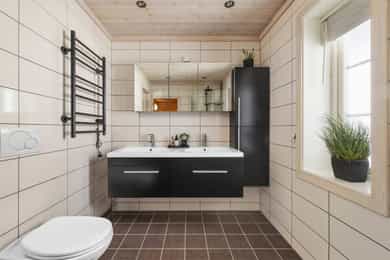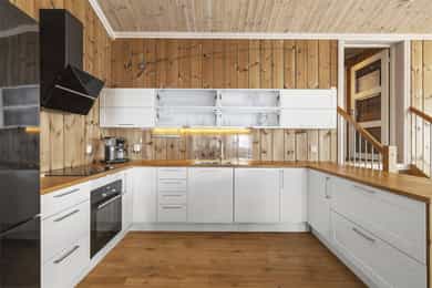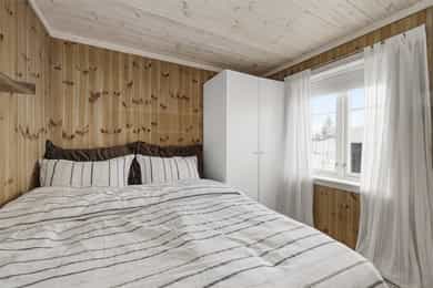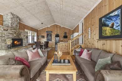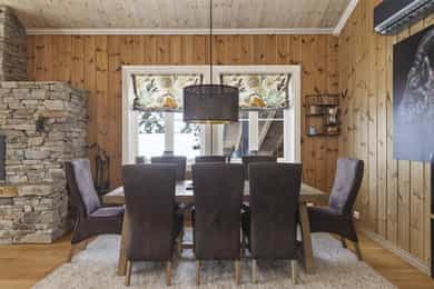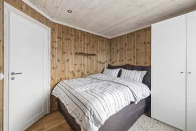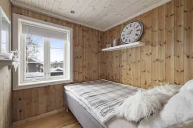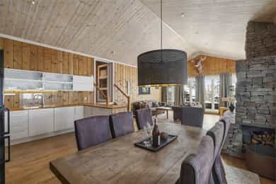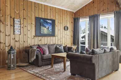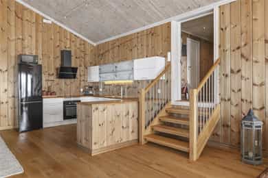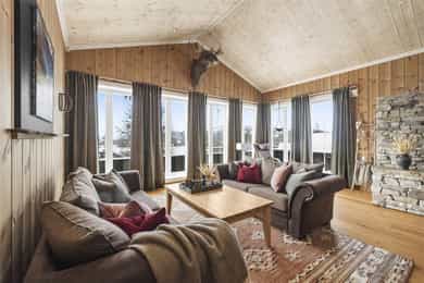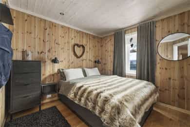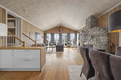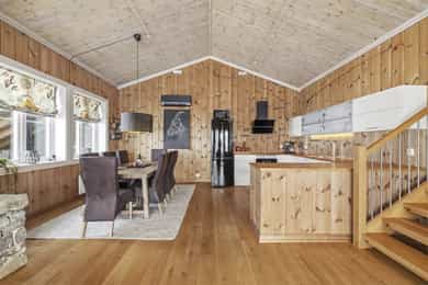Denne flotte fritidsboligen består hovedsakelig av flislagte gulv og eikeparkett, trepanel på vegger og i himling. Det er god takhøyde i stuen og store vinduer som gir fint med lys inn i fritidsboligen. Fra inngangsparti kommer du inn i romslig hall med fliser og varme i gulv. Det er plass til å henge fra seg yttertøy og sette fra seg sko. Fra hall er det videre inngang til oppholdsrommene i 1. etasje, samt soverom, baderom og bod. Trapp opp til 2. etasje. Stue, spisestue og kjøkken Det er romslig og koselig stue og spisestue i åpen løsning med kjøkkenet. Denne planløsningen gjør dette til et sosialt og hyggelig allrom. Det er god plass til sofagruppe, hvilestoler og spisestue. Flott peis med innsats sørger for hyggelig stemning og god oppvarming i tillegg til varmepumpe. Spisestuen er praktisk plassert ved kjøkkenet, med god plass til langbord som innbyr til hyggelige måltider og sosiale lag. Det er utgang til uteområdet via dobbel verandadør fra stuen og verandadør fra spisestuen. Sofagruppe og spisestue medfølger hytta ved salg. Kjøkken Pent og tidløst kjøkken med innredning fra Strai Kjøkken. Hvite, lett profilerte fronter og heltre benkeplate. Det er god oppbevaringsplass i underskap/skuffer og overskap og gode arbeidsflater. Innredning har integrerte hvitevarer som stekeovn, platetopp og oppvaskmaskin. Frittstående kjøl/fryseskap. Baderom Baderommet har fliser på vegger og gulv, med varmekabler. Trepanel i himling med spotter. Badet inneholder dusjhjørne med innfellbare glassvegger og vegghengt dusjgarnityr. Romslig baderomsinnredning med slette fronter og dobbel overliggende servant. Vegghengt speilskap, høyskap og håndkletørker. Gulvstående toalett. Fra baderommet er det videre adkomst til badstuen! Vaskerom/teknisk rom/bod Rommet har fliser på gulv, og har opplegg til vaskemaskin samt. utslagsvask på vegg. Hyller med gode oppbevaringsmuligheter. Det er 4 soverom i denne fritidsboligen. Soverom 1 og 2 er romslige med god plass til dobbeltseng og tilhørende soveromsmøbler. Soverom 3 og 4 har plass til brede senger.