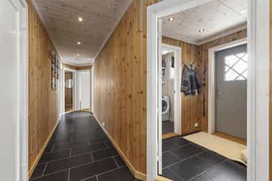 Entré/hall med garderobeplass,, gang, stue, kjøkken, 4 soverom, baderom, badstue og vaskerom/teknisk rom/bod. Utvendig bod.