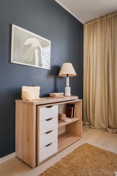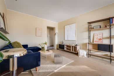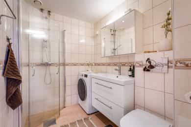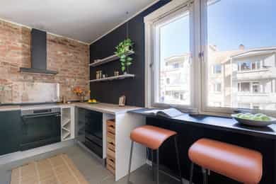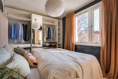 Velkommen inn! Leiligheten ligger i en rolig blindvei med svært lite biltrafikk, noe som gir en trygg og skjermet beliggenhet. Det er mulighet for å leie parkeringsplass i umiddelbar nærhet. Entréen er romslig og innbydende, med god plass til å henge fra seg yttertøy og sette fra seg sko på en ryddig måte. Den praktiske garderobeløsningen gir rikelig med oppbevaringsplass til klær og sko, og bidrar til en strukturert og funksjonell hverdag. Det er også gulvvarme i entréen som gir ekstra komfort. Fra entréen har du direkte adkomst til kjøkkenet. Kjøkken: Kjøkkenet ble oppgradert i 2020 og fremstår stilrent med glatte fronter og heltre benkeplate med nedfelt vaskekum. Her er det rikelig med oppbevaringsplass i både skap og skuffer, samt god benkeplass som gjør matlagingen både praktisk og effektiv. Hvitevarene er integrerte og består av platetopp, stekeovn og oppvaskmaskin, samt frittstående kjøleskap. Over kokesonen er det montert kullfilterventilator. Bad: Badet er fra 2001 og har flislagte overflater samt elektrisk gulvvarme for økt komfort. Rommet er innredet med vegghengt toalett, moderne baderomsinnredning med servant og underskap, speilskap og innfellbare dusjvegger. Himlingen er utstyrt med innfelte downlights som gir behagelig belysning. Det er i tillegg praktisk opplegg for vaskemaskin. Stue: Stuen er romslig og har en takhøyde på ca. 2,56 meter. Kombinasjonen av god takhøyde og store vindusflater gir en lys og luftig atmosfære. Her er det god plass til sofagruppe med tilhørende stuebord, samt spisebord for hyggelige sammenkomster. Veggene er nylig malt i delikate fargetoner, og rommet har et pent 1-stavs parkettgulv som gir et moderne og helhetlig uttrykk. Balkong: Balkongen er på ca. 7 m² og vender mot sørøst. Her er det god plass til utemøbler og grill (elektrisk eller gass). Selger opplyser om gode solforhold gjennom sommerhalvåret, og den luftige utsikten gir en fin ramme for å nyte sene sommerkvelder. Hovedsoverom: Hovedsoverommet er romslig og har plass til stor dobbeltseng. Sengegavlen som er laget av selger har praktiske oppbevaringsrom på sidene og oppbevaringsmuligheter fra toppflaten, noe som gir både funksjonalitet og særpreg. Veggene er malt i en vakker blåtone med kalkmaling som gir rommet en lun og behagelig atmosfære. Det er god plass til garderobeløsning. Soverom 2: Leilighetens andre soverom er også romslig og har plass til seng, skrivebord, nattbord og garderobeløsning. Rommet egner seg ypperlig som barnerom, gjesterom eller hjemmekontor. Bod: Leiligheten disponerer tre boder på henholdsvis ca. 5 m², 4 m² og 2 m²som gir svært gode lagringsmuligheter.