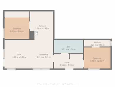 BRA-i: 65 kvm. Gang, 2 soverom, bod, bad, kjøkken og stue.