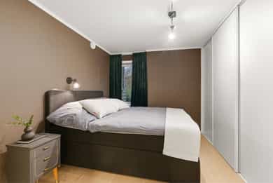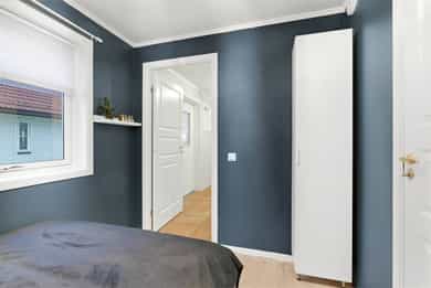 2020: Pusset opp hovedsoverom med ny parkett og satt inn skyvedørsgarderobe med innredning fra Garderobemannen med 3,4 m bredde