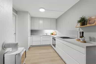 2021: Renovert kjøkken med nye hvitevarer, malt stue/kjøkken og lagt 60W varmefolie i gulv og laminat på gulv