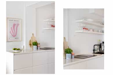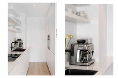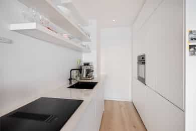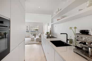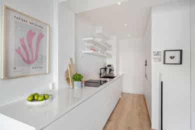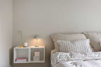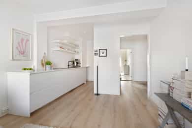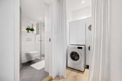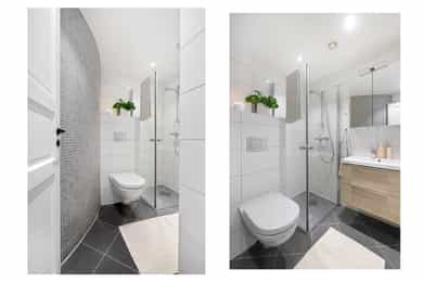 Entré: Velkommen inn! I leiligheten møtes du av en lys gang som gir et umiddelbart godt førsteinntrykk. Leiligheten er i stor grad pusset opp i 2021, og fremstår stilren og gjennomført. Det er plass til garderobeskap samt knagger og skohylle for oppbevaring av yttertøy. Gangens sentrale plassering gir effektiv flyt i boligen. Åpen kjøkken- og stueløsning: Moderne kjøkken fra 2021 med skjermet og god plassering i rommet. Stilsikker innredning med hvite, glatte fronter og benkeplate i laminat. Kum og ett-greps blandebatteri. Kjøkkenet er utstyrt med integrerte hvitevarer av god kvalitet, og består av komfyr, platetopp med avtrekk fra AEG, oppvaskmaskin, kjøl/fryseskap. Det er kjøkkenventilator med kullfilter. Det er montert waterguard og komfyrvakt. Varmtvannstanken (ca. 120 liter) er plassert i benkeskap. Kjøkkenet er utnyttet til det maksimale med lagringsplass i både vegghengte hyller, skap og skuffer. Det er god plass til spisebord ved kjøkkenet. Leiligheten har en stor og herlig stue med store vindusflater, god planløsning og utgang til balkong. I stuen er det god plass til sofagruppe med tilhørende sofabord og tv-møblement og stort spisebord. Store vindusflater gir godt innslipp av naturlig lys. Leiligheten har stilrene overflater pusset opp i 2021, med pen, en-stavs laminat, lyse fargevalg og downlights i himling. Stuen har en planløsning som oppleves naturlig og enkel å innrede i ulike soner, det finnes flere gode møbleringsalternativer. Leiligheten holder høy standard - hit kan du flytte rett inn. Fra rommet er det utgang til en nordøstvendt balkong på ca. 5,1 kvm. Her er det plass til utemøblement, grill og beplanting. Høyt og fritt i 3. etasje med fin, åpen og usjenert utsikt. Soverom: Leiligheten har et lunt og innbydende soverom av god størrelse. Her er det plass til dobbeltseng med tilhørende nattbord på hver side samt kommode eller lenestol. Soverommet er malt i en behagelig fargetone som passer godt med gulvet og interiøret for øvrig. Rommet har stort vindu som sikrer godt med lys og luft, samt et usjenert og åpent utsyn. Direkte adkomst til walk-in closet med åpen garderobeløsning og skyvedør. Her er det godt med lagringsplass. Bad: Flott, flislagt bad oppgradert i 2015 (ifølge tidligere salgsoppgave). Badet har flislagte overflater, elektriske varmekabler og belysninger med spotter. Badet inneholder dusjhjørne med innfellbare dører i glass, vegghengt toalett og baderomsinnredning med skuffer, servant med ett-greps blandebatteri og speil på vegg. Ved badet finnes tilkobling for vaskemaskin. Vaskenisjen er skjermet med forheng og har praktisk oppbevaringsplass. Overflater: Gulv: En-stavs laminat (2021) i oppholdsrom. Fliser med gulvvarme på badet. Vegger: Glatte, malte flater (2021) og fliser på badet. Himling: Malt himling med plater. Takhøyden i stuen er oppmålt til ca. 2,5 meter.