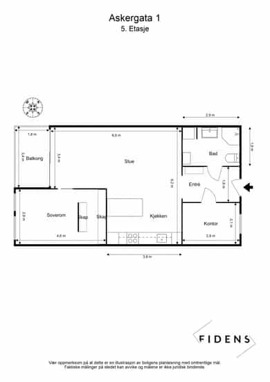 Leiligheten ligger i 5. etasje og inneholder: Entré, stue/kjøkken, bad, soverom og kontor.