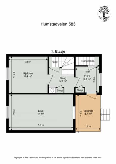 BRA-i: 34 kvm. Entré, kjøkken, stue, trapperom, gang og bod.